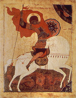 | Ton 4. Tropar des Großmärtyrers. Im guten Kampf kämpftest du mit Glauben, Kämpfer Christi, / hast die Gottlosigkeit der Quäler gerügt / und dich als wohlgefälliges Opfer Gott dargebracht; / deshalb hast du auch den Siegeskranz erhalten. // Durch deine Fürbitten, Georgius, gewährst du allen Verzeihung der Verfehlungen. | Ton 4. Tropar des Großmärtyrers. Als der Gefangenen Befreier und der Armen Beschützer, / als der Schwachen Arzt und der Könige Fürstreiter, / du Siegeszeichenträger und Großmärtyrer Georgius, / lege Fürbitte ein bei Christus Gott, // dass errettet werden unsere Seelen. | Ton 4. Kondak des Großmärtyrers. (nach: O der du freiwillig erhöht wardst) Bebaut von Gott, erschienest du als ein Landmann, / der auf die Frömmigkeit allehrwürdig baute, / indem der Tugend Garben du dir sammeltest. / Denn mit Tränen sätest du, und du erntest mit Freude, / ‹schön› hast du gekämpft bis aufs Blut / und bist so gelangt zu Christus. // Durch deine Fürbitten, Georgius, gewährst du allen Verzeihung der Missetaten. |