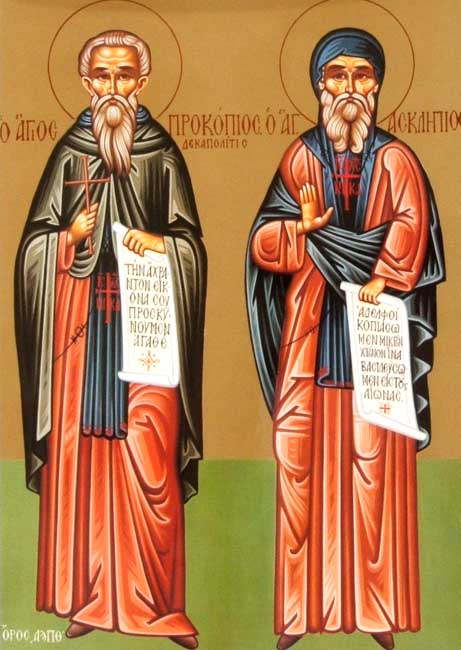 | Ton 8. Tropar des frommen Vaters. Durch die Ströme deiner Tränen hast du das Unfruchtbare der Wüste urbar gemacht, / und durch die Seufzer aus der Tiefe hast du die Mühen zu hundertfältiger Frucht gebracht. / So bist du zu einem Lichtstern geworden, der dem Erdkreis leuchtet durch seine Wunder. / Prokopius, unser gottseliger Vater, lege Fürbitte ein bei Christus Gott, // dass errettet werden unsere Seelen. | Ton 4. Kondak des frommen Vaters. (nach: Heut’ bist du erschienen) Als Morgenstern besitzt dich die Kirche heute / und vertreibt die ganze Finsternis der Irrlehre, // indem sie dich ehrt, Himmelsmyste, herrlicher Prokopius. | |